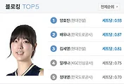 7일 현재 문정원이 리시브 1위(4.298개), 임명옥이 2위(세트당 3.298개)에 이름을 올리고 있다.