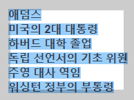 미국의 2대 대통령 애덤스는 하버드 대학을 졸업한 뒤에 1776년 독립 선언서의 기초 위원으로 활약을 했습니다